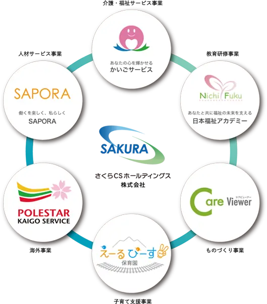 さくらCSホールディングスは、介護・福祉サービス「さくらのかいご」を中核に、教育研修(日本福祉アカデミー)、介護特化人材サービス(SAPORA)、介護記録アプリ開発(CareViewer)、子育て支援(えーるぴーす保育園)、海外事業まで幅広く展開しています。現場・人材・テクノロジー・国際連携を一体で担うことで、働く人の成長機会と安定したキャリアを支える、持続可能な福祉の未来を創造しています。