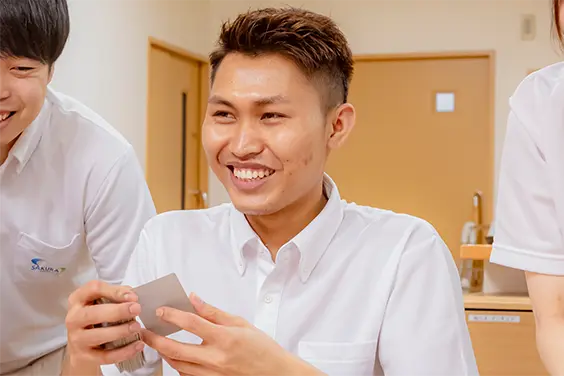 現在は介護福祉士の資格取得を目標に、足りない部分をスキルアップ中。これからも知識と技術を磨き、利用者さんに愛される存在になりたいと思っています。